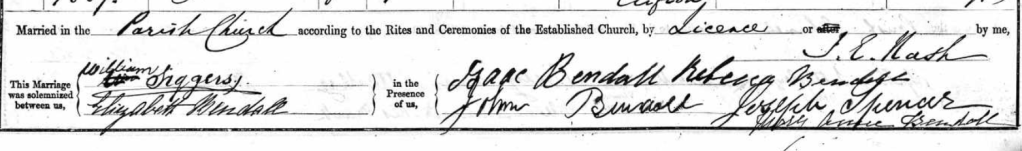Instead of the customary single signature the witness, five signatures appear, four of whom are family members. The first witness, Rebecca, Elizabeth’s sister, was a servant in the household of the clergyman who officiated, Rev’d Nash and, later on, another sister appeared in his household as a servant.