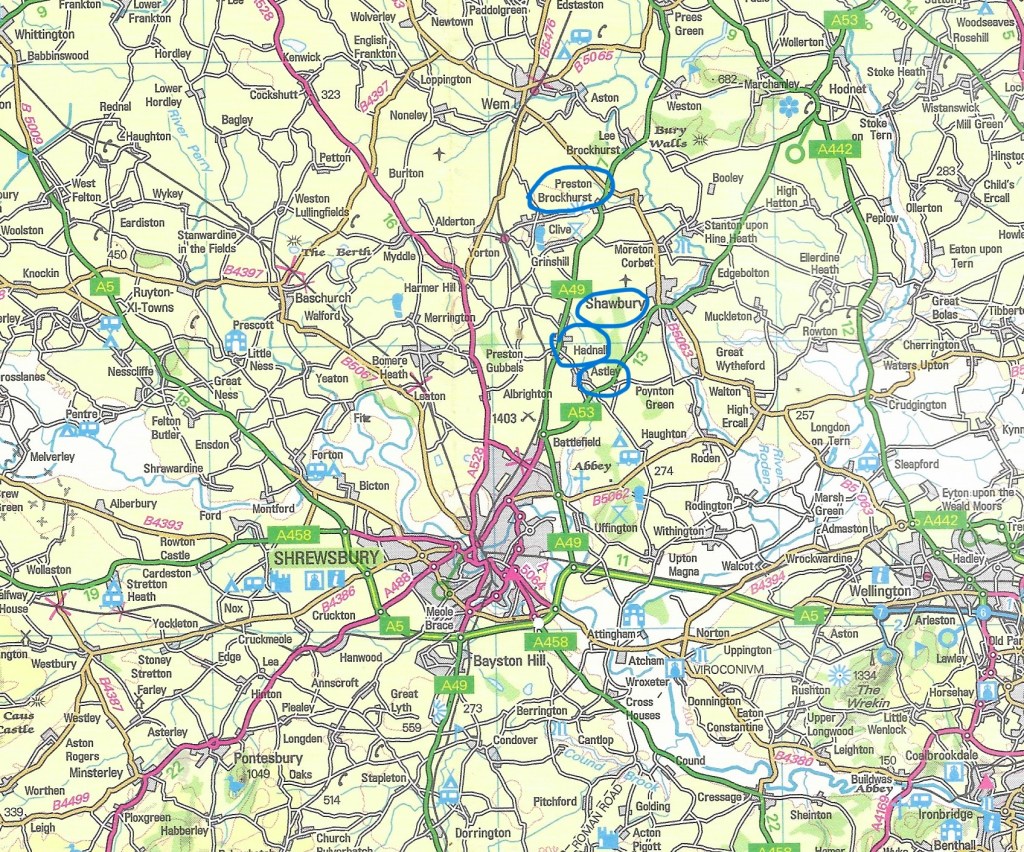 In the next Census, Elizabeth was living in Shropshire with her married sister Clara and her family, in Preston Brocklehurst, a few miles north of Shrewsbury. Clara died four years later, and Elizabeth continued to live with her brother-in-law, James Deakin, and her nephews. The family moved several times, to the places circled in blue, but never far.