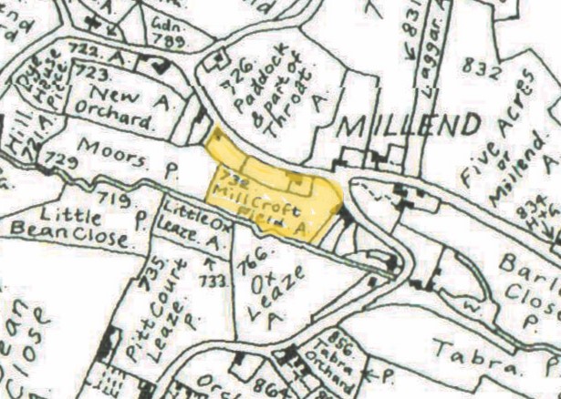 In 1841, the Trotman family – Elizabeth, George and Tamar, with their parents Simon (an agricultural labourer) and Martha, and three older siblings, were living at Millend, in the house that is now called Millend House. Simon rented the area highlighted in yellow from Robert Mason junior, acting as the trustee of Margaret Hooper.