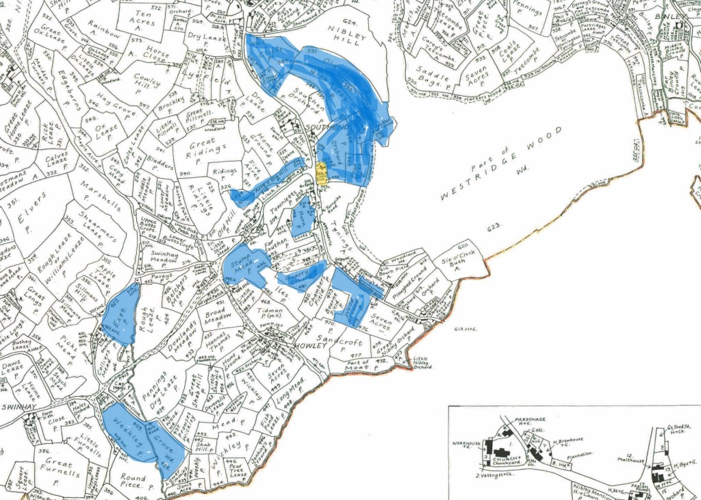 Thomas senior (the husband of Ann Baker) had left his estate in trust until his wife’s death, which happened in 1843. One of the trustees was his son in law, Thomas Park. The farm was sold in March 1844. The map shows, shaded in blue, the area that Thomas Park was farming at the time of the sale, with Southend Farm highlighted yellow. He also farmed 3 strip fields in the Lotts, in the centre of the map.