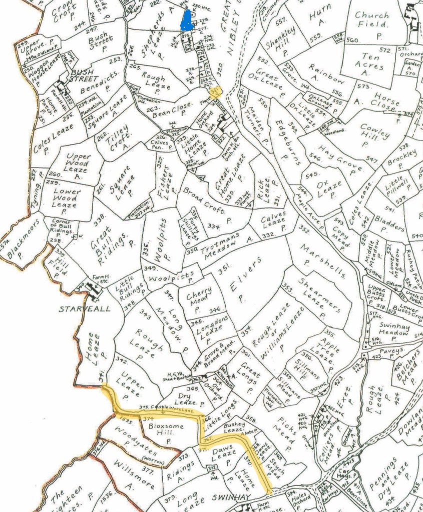 In the 1841 Census, Jane and Emma were living on Nibley Green. Their father leased a cottage house, garden and orchard from William Lee Jortin, marked in blue on the map.