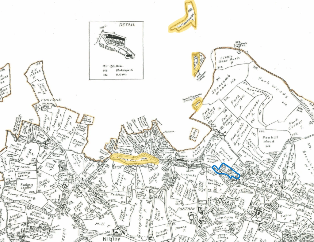 In 1841, Rebecca, Sarah and Ann lived at Crowel Mill, with their parents. Henry (recorded as a clothier) and Esther (nee Perrett). The area that Henry held freehold is outlined in blue in the map below, but he also leased the areas outline in yellow from Earl Berkeley.