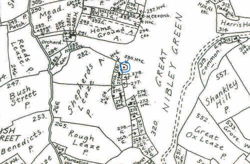 In the ’41 Census, Sophia and Thomas were living in a cottage at the lower end of Nibley Green, with their parents and elder brother, William. It was rented from Daniel Deane, a local farmer and is plot number 280 on the Tithe Map, circled in blue. Berkeley Cottage now stands on the site.