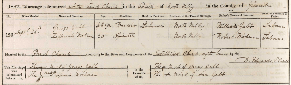 It can be seen that both George and Zipporah were illiterate, signing with their mark. Zipporah’s sister Ann, who had married Henry Gabb in 1849, was a witness, and both she and her husband were illiterate as well.
